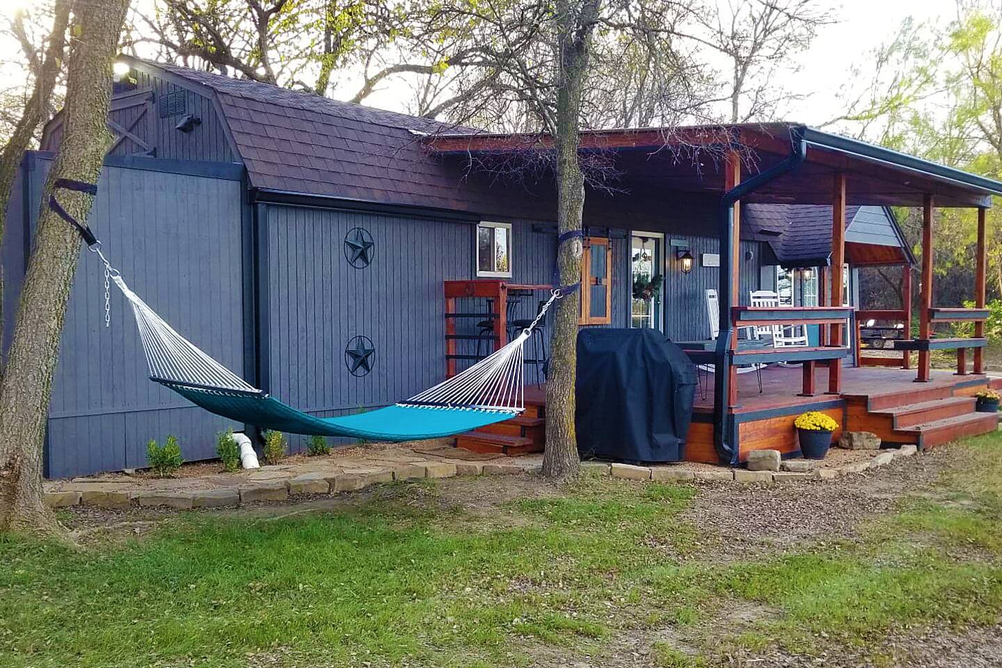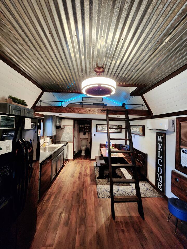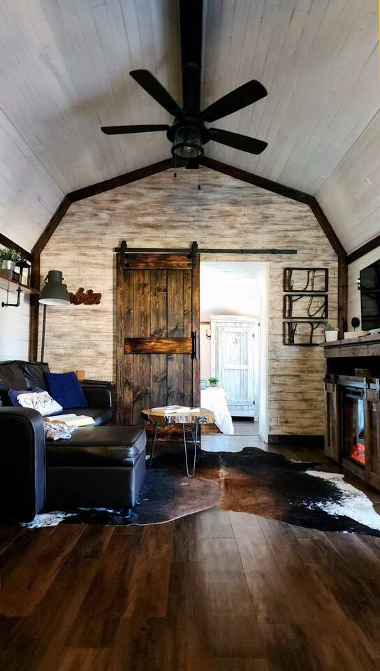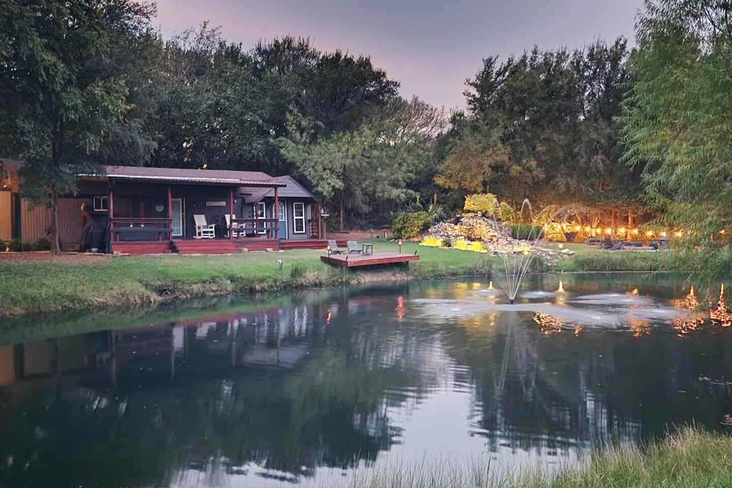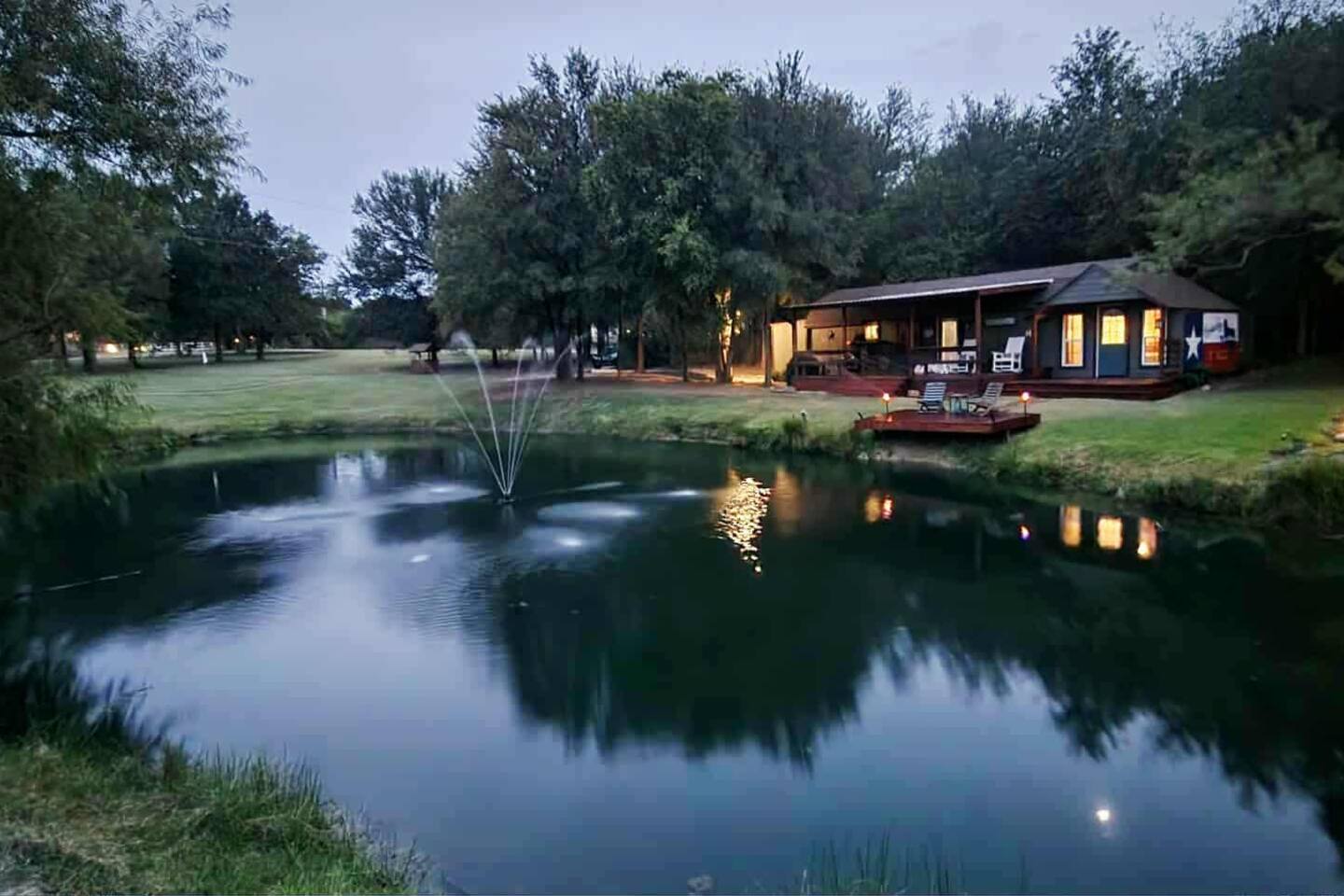 Unwind after a full day of exploring in a peaceful, cabin setting within 45 minutes of all DFW area attractions. A country getaway on 5 acres with a stocked pond. Begin each morning with a cup of coffee while watching the pond come to life from the spacious front porch rocking chairs. Evenings are made for gathering around the firepit, roasting s’mores under starry skies, and making memories. Experience the charm of a tiny home without sacrificing comfort or relaxation space.