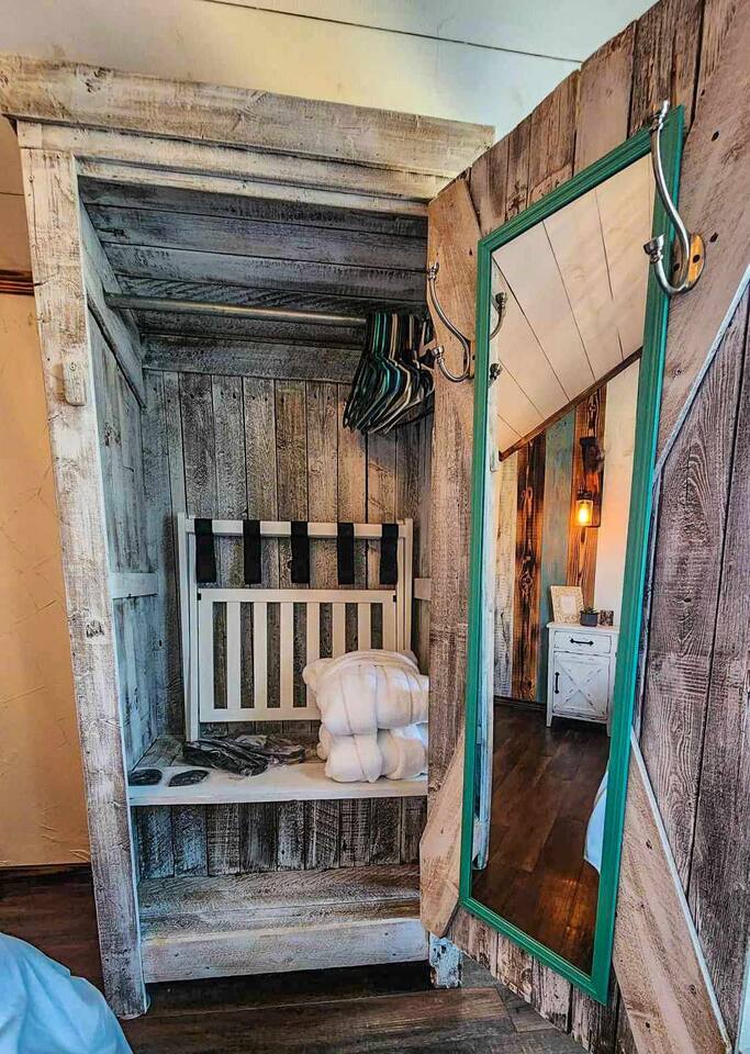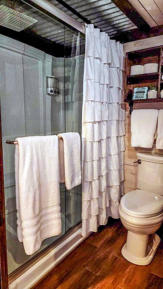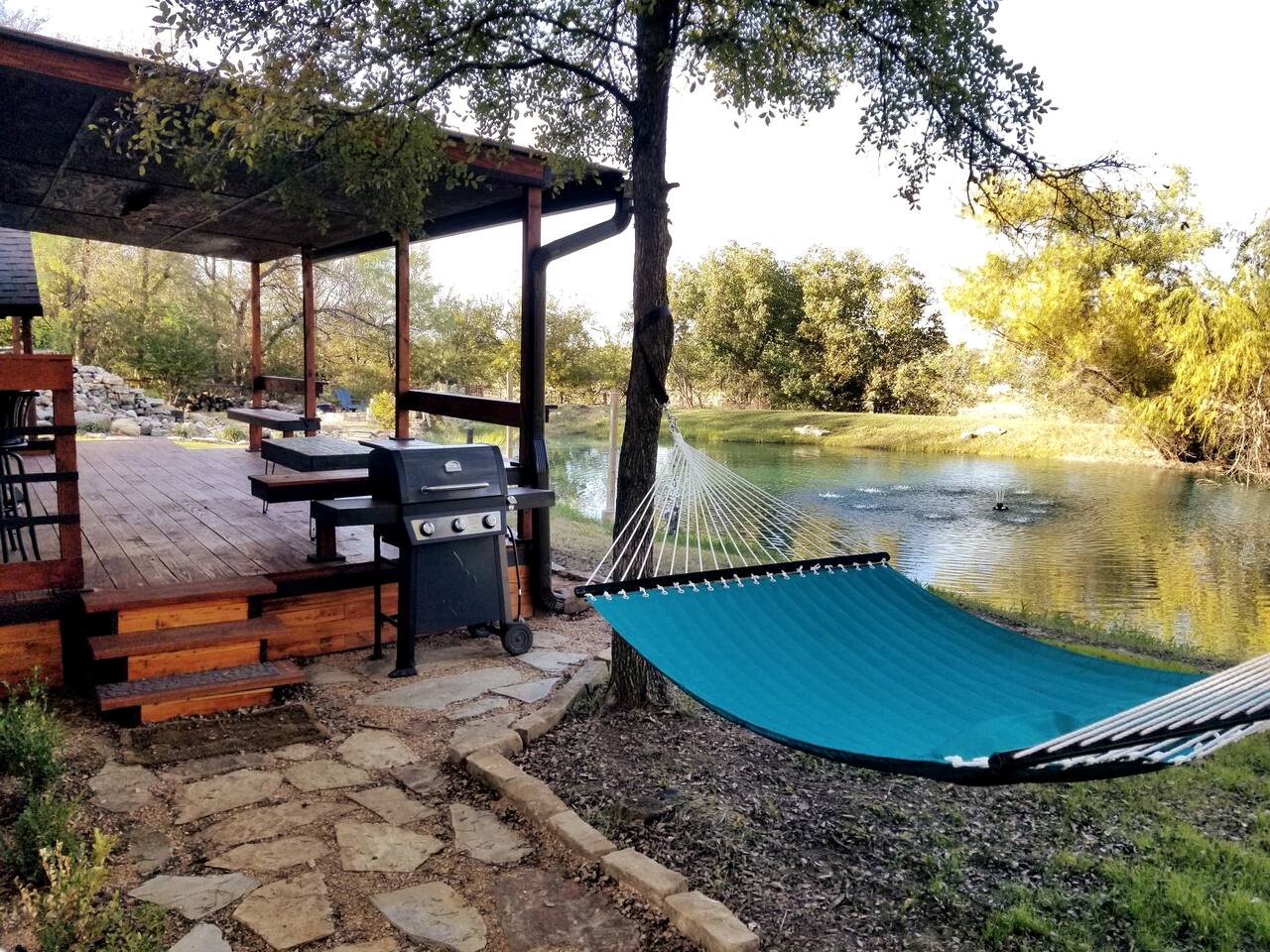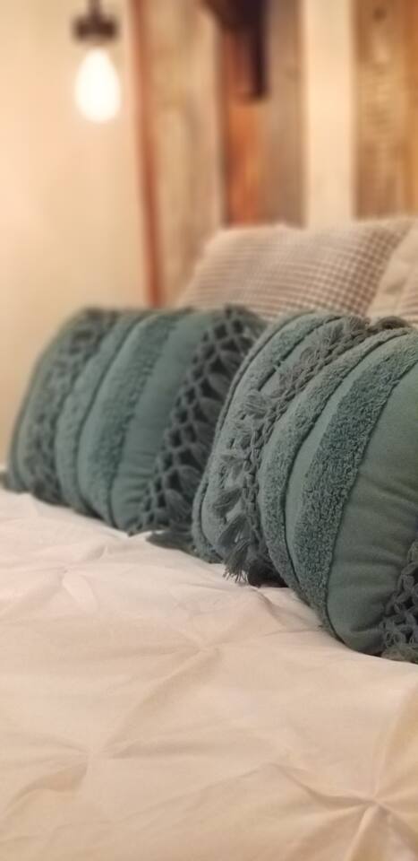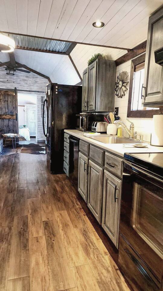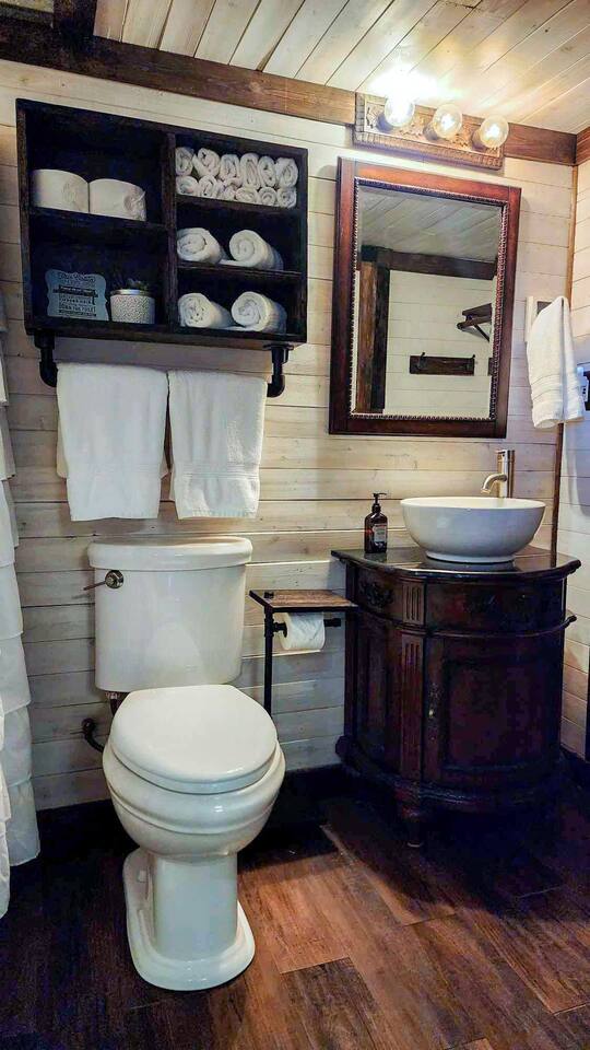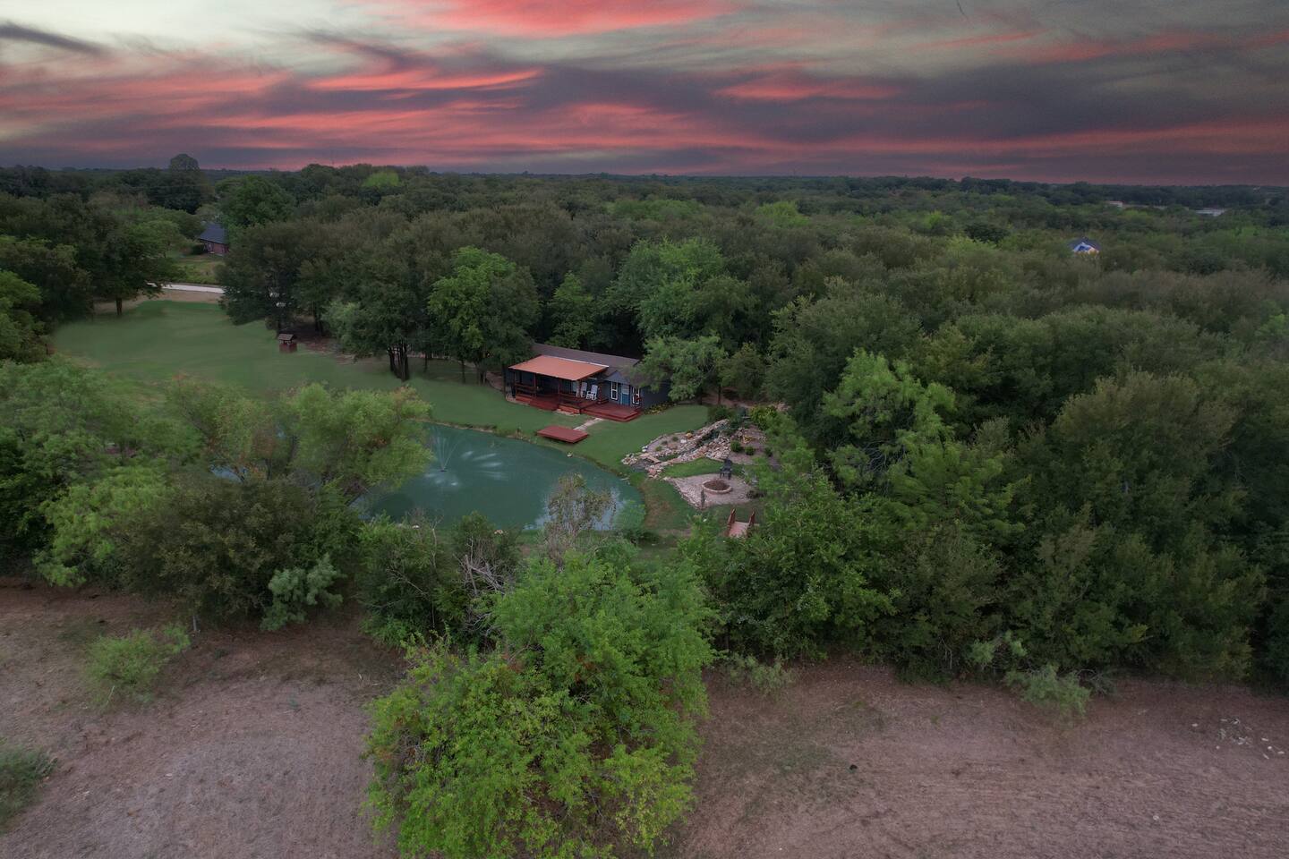 Unwind after a full day of exploring in a peaceful, cabin setting within 45 minutes of all DFW area attractions. A country getaway on 5 acres with a stocked pond. Begin each morning with a cup of coffee while watching the pond come to life from the spacious front porch rocking chairs. Evenings are made for gathering around the firepit, roasting s’mores under starry skies, and making memories. Experience the charm of a tiny home without sacrificing comfort or relaxation space.