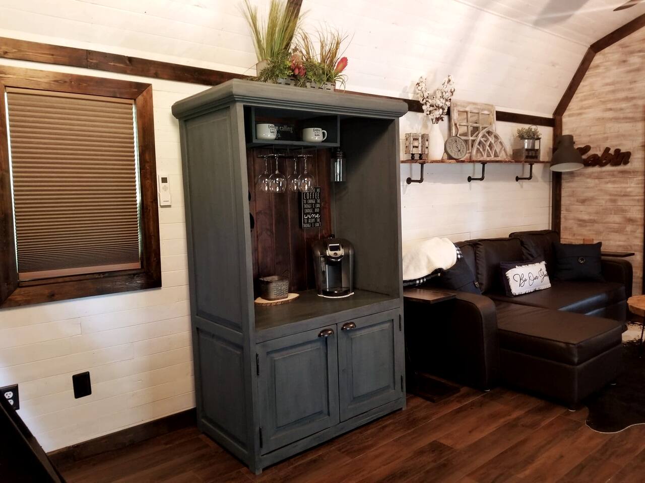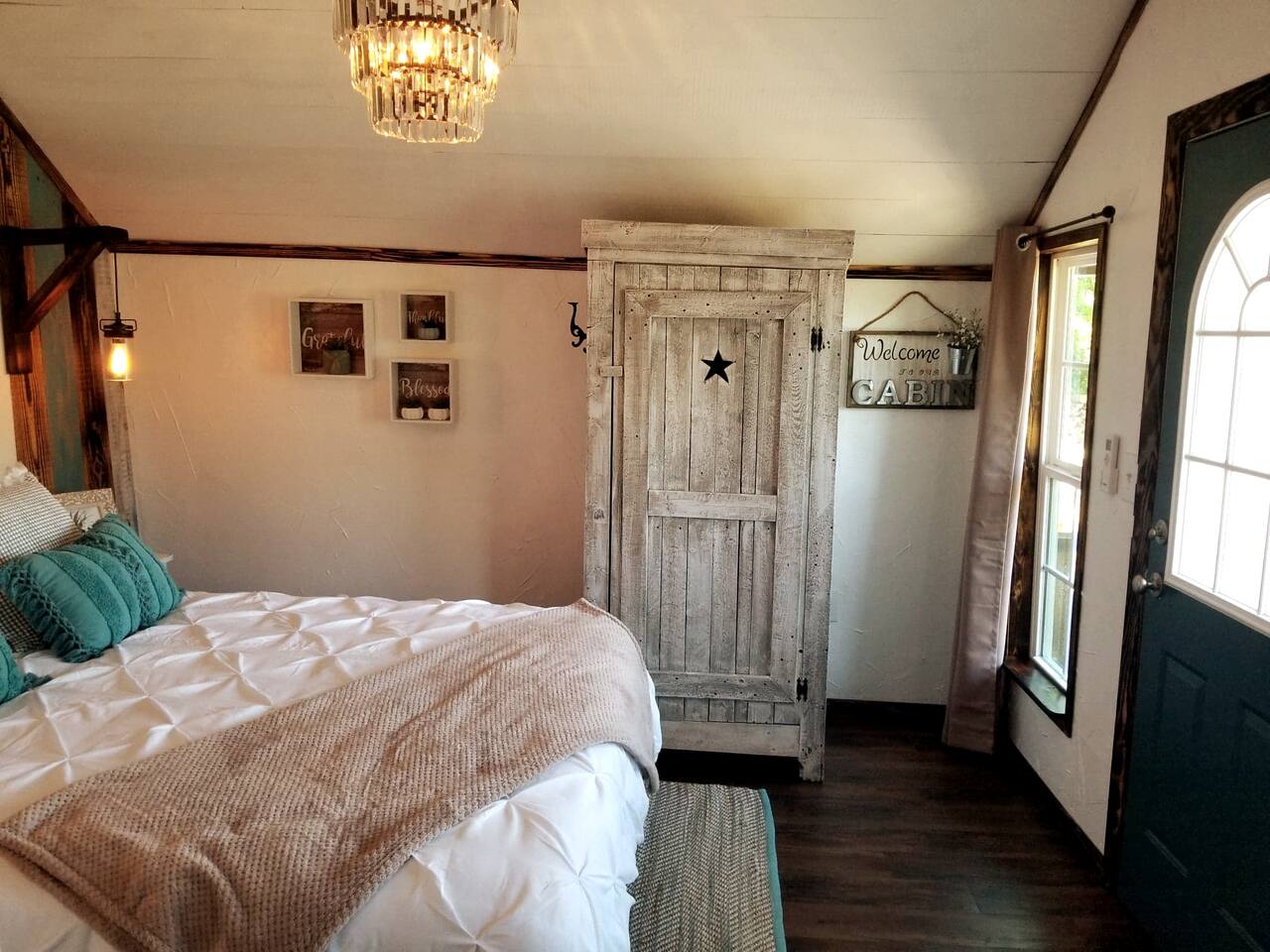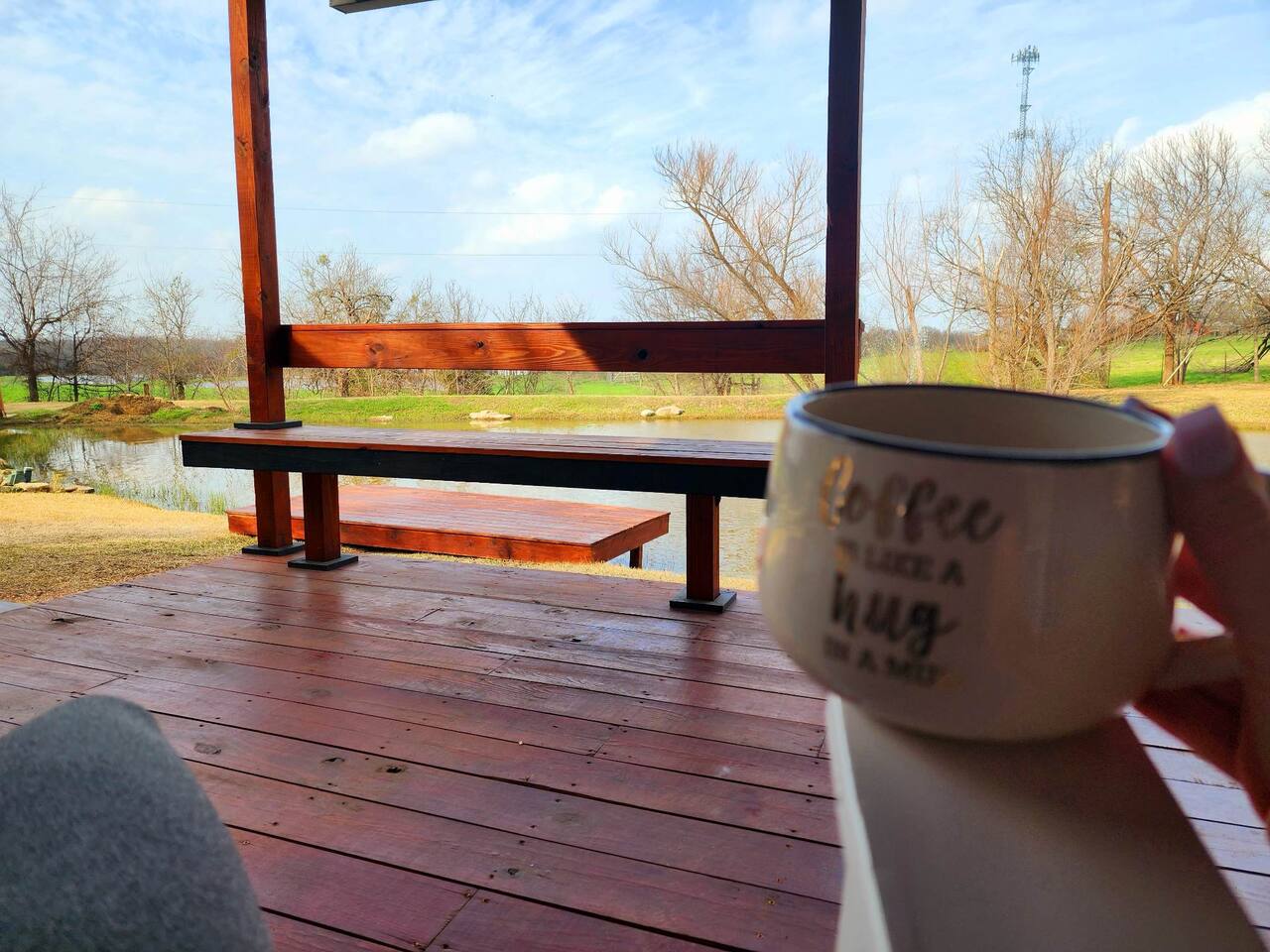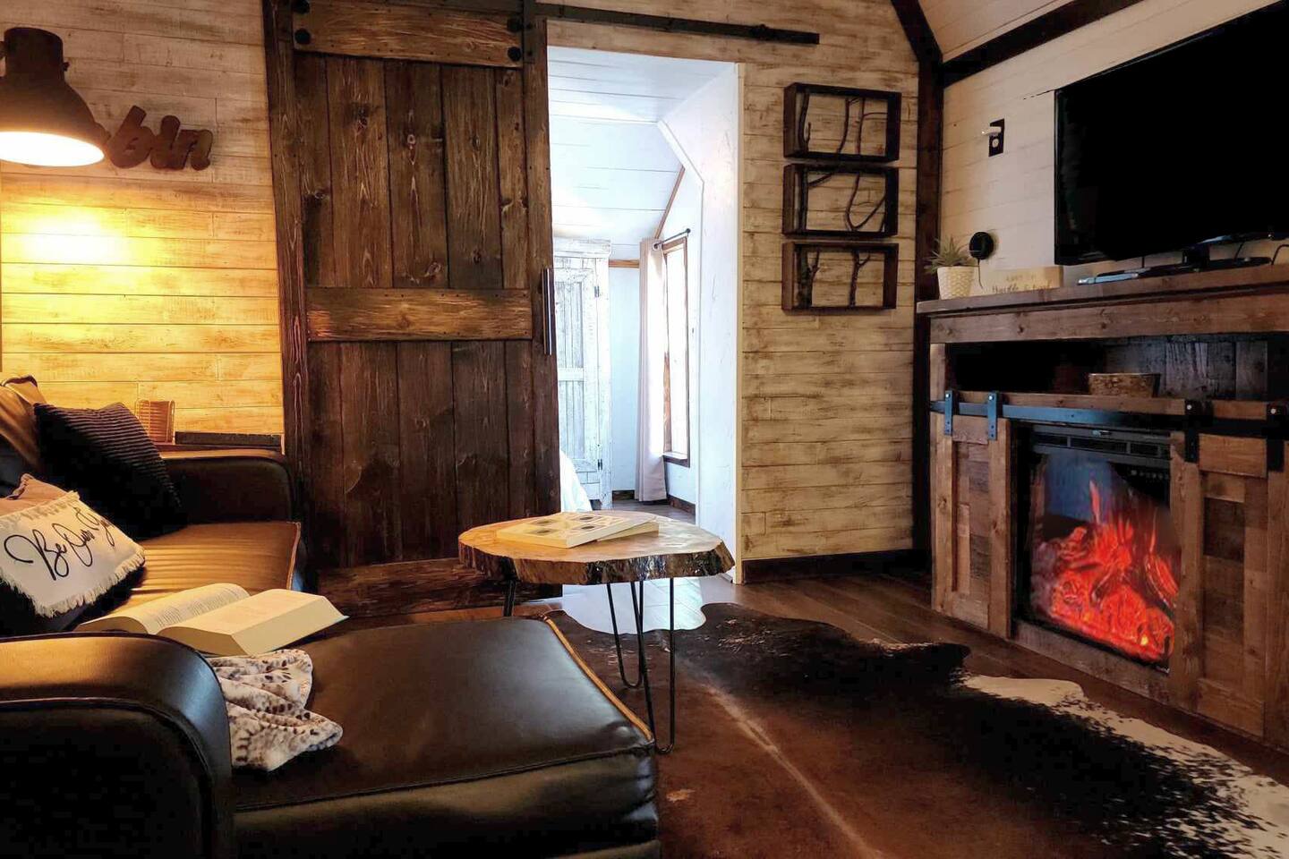 Unwind after a full day of exploring in a peaceful, cabin setting within 45 minutes of all DFW area attractions. A country getaway on 5 acres with a stocked pond. Begin each morning with a cup of coffee while watching the pond come to life from the spacious front porch rocking chairs. Evenings are made for gathering around the firepit, roasting s’mores under starry skies, and making memories. Experience the charm of a tiny home without sacrificing comfort or relaxation space.