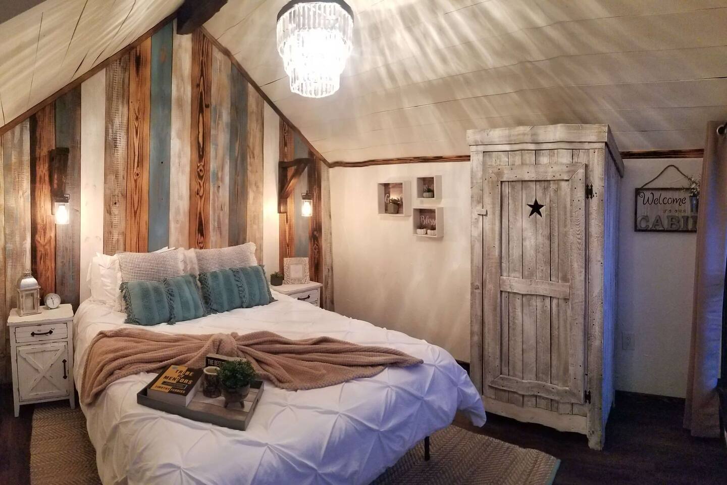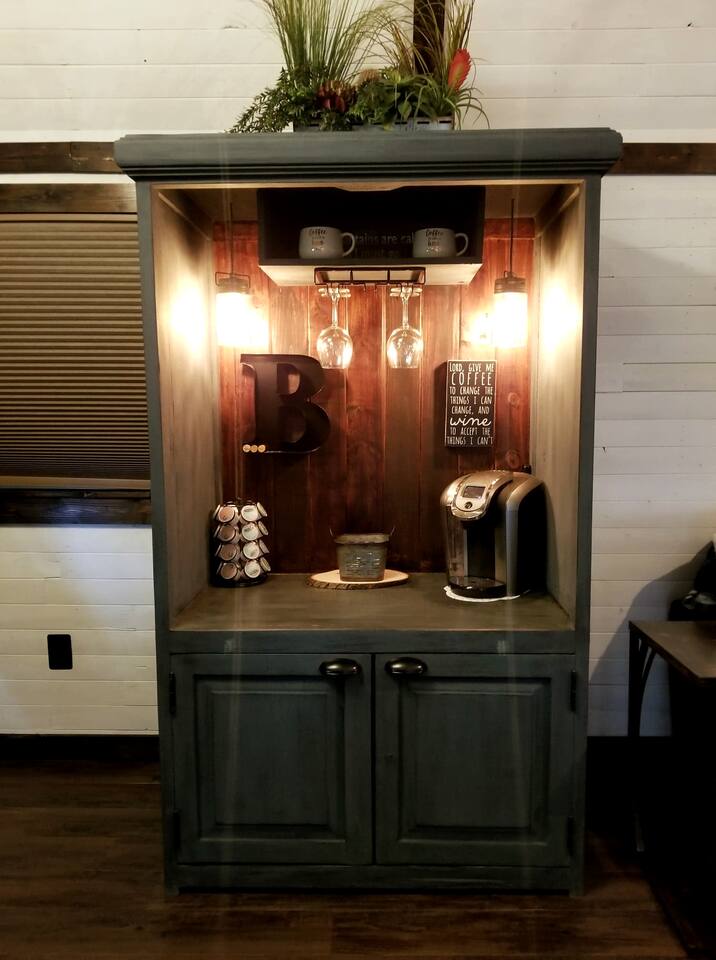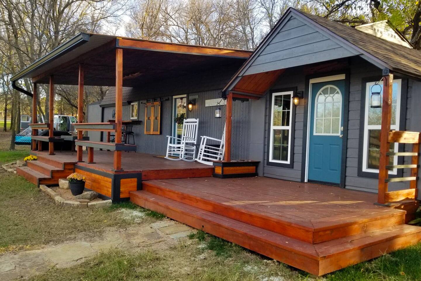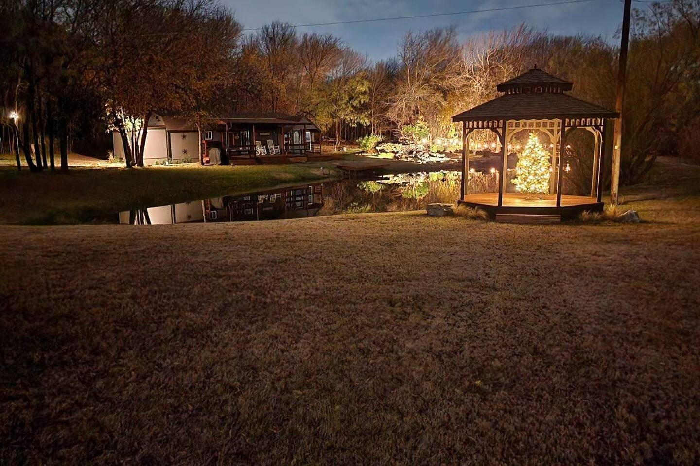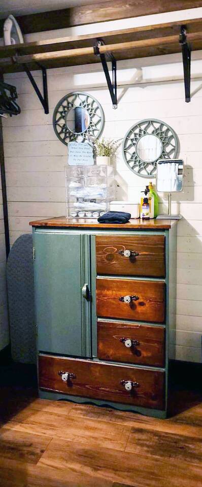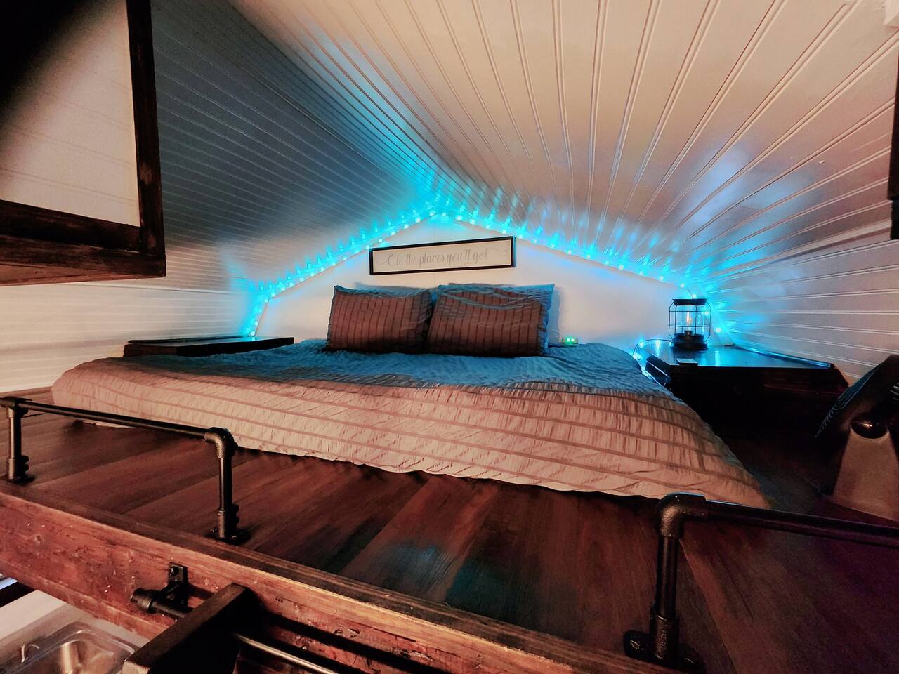 Unwind after a full day of exploring in a peaceful, cabin setting within 45 minutes of all DFW area attractions. A country getaway on 5 acres with a stocked pond. Begin each morning with a cup of coffee while watching the pond come to life from the spacious front porch rocking chairs. Evenings are made for gathering around the firepit, roasting s’mores under starry skies, and making memories. Experience the charm of a tiny home without sacrificing comfort or relaxation space.