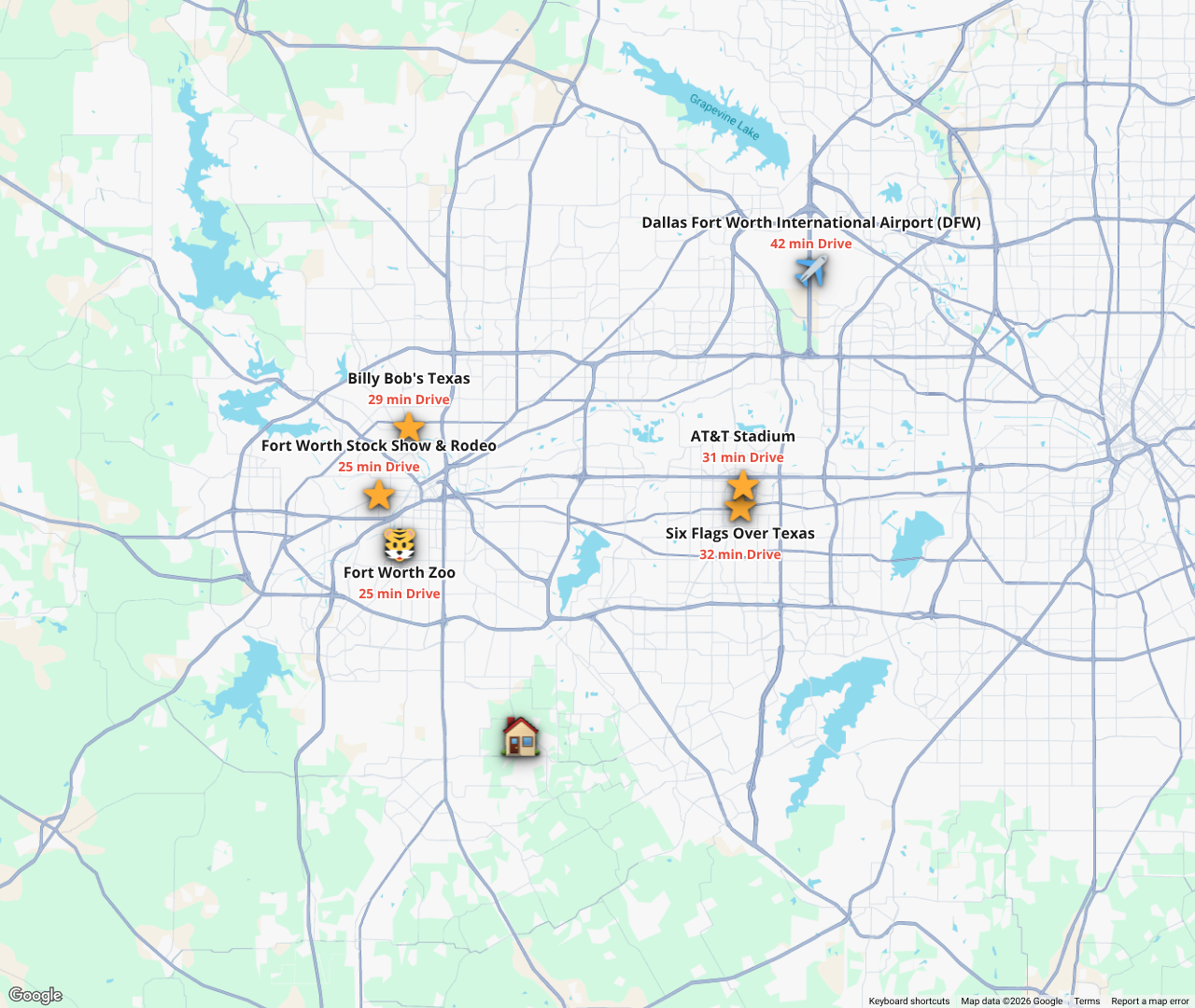 We are 10 minutes from the city of Burleson where you will find grocery stores and enjoy many wonderful restaurants. We are approximately 25 minutes to the Fort Worth Stockyards and just a short 45 minute drive to Arlington where you will find Cowboys Stadium, Rangers Park, Waterpark, 6 Flags, Texas Live etc.!