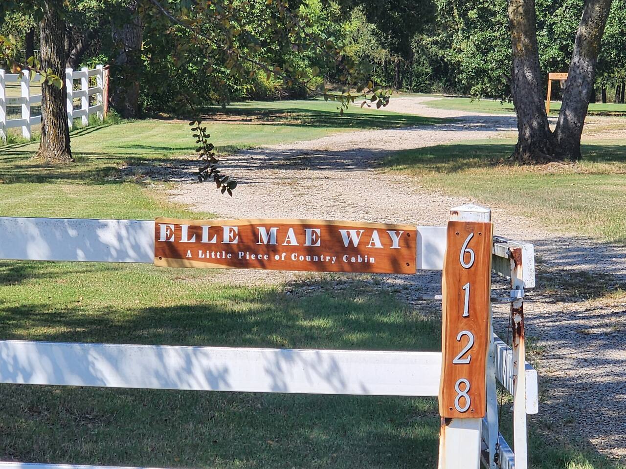 The address to the cabin is 6128 which is listed on the white fence at the entrance. However, the main home on the property's is 6120 and may be the first address you see from the street. It will be the address to help you identify you are at the correct location. Please look for the sign that says "Elle Mae Way", and the address sign of 6128 which is located on the edge of the white gate located on the South side of 6120. follow this gravel drive around to the back of property and park right next to cabin.
