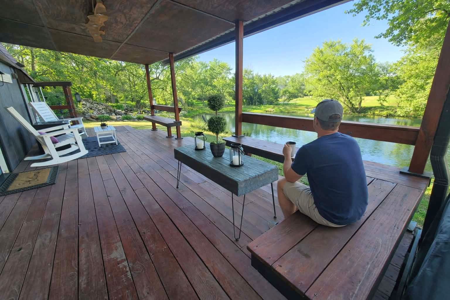 Unwind after a full day of exploring in a peaceful, cabin setting within 45 minutes of all DFW area attractions. A country getaway on 5 acres with a stocked pond. Begin each morning with a cup of coffee while watching the pond come to life from the spacious front porch rocking chairs. Evenings are made for gathering around the firepit, roasting s’mores under starry skies, and making memories. Experience the charm of a tiny home without sacrificing comfort or relaxation space.